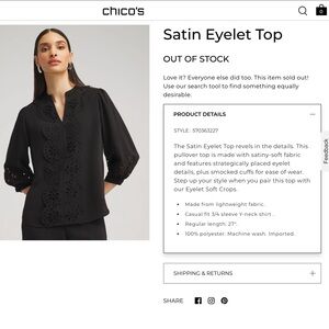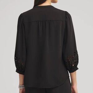 CHICO’S Satin Eyelet Popover Blouse in Black, Women's size 16, Chico's size 3. This shirt is a stand out with great detail and is made with easy wash and wear material, in excellent condition, like new. See photos for additional details.