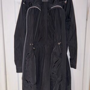 Elegant black trench coat with a sleek design. Features a practical hood and front zipper. Ideal for versatile styling. Great condition. Smoke free home
