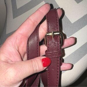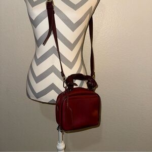 Sole Society Douga Burgundy Red Square Zipper Adjustable Crossbody Handbag. Zipper closure goes all the way around the bag. Both sides of the bag are the same - there’s a small mark on one side so it can be worn on the side with no blemish. Crossbody strap is adjustable and removable, you can use the small, knotted handle instead. Small zippered pocket inside. Solid dark red with darker contrast red/burgundy piping, handle and strap.