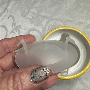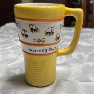 This is a preowned, RARE, in like new condition, “Morning Buzz” 12oz. travel mug. It features raised hand painted bumble bees & debossed lettering. The lower section is a ribbed textured design. It is for hot or cold beverages. It has a turn lock closure. This is Micro & dishwasher safe mug. Purchased about 20 yrs ago for my mom. She has passed, but had a mug fetish & had many.