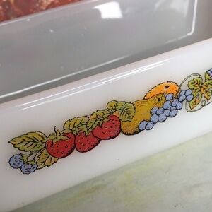 White Vintage Milk Glass Casserole Dish Baking Pan Loaf Pan from the Fire King Line with Fruit Design By Anchor Hocking