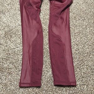 Stylish burgundy leggings by Fabletics. Features ribbed detailing. Perfect for workouts or casual wear. Tag missing please see photos for measurements
