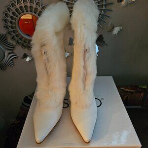 Fuzzy, fun and fabulous! These show stopping boots are all about timeless winter style and fierce, feminine confidence. You’re going to love the style boost they give to your cold-weather outfits. Pointed-toe boot has fluffy faux-fur trim, a kitten heel and easy zip front.