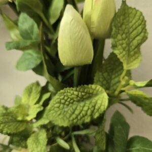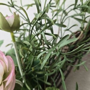 The greenery in this wreath is basil, mint, rosemary, and rose leaves. It is finished with a farmstyle cotton ribbon imported from France.