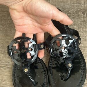 Stylish Tory Burch sandals. Sleek black design. Perfect for casual wear.