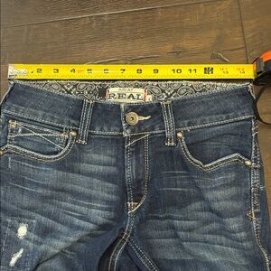 Chic boot cut jeans with distressed details. Dark blue hue. Perfect for casual outings. Size is 28L. Brand is Ariat.