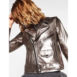 ZARA Genuine Leather Jacket Silver Metallic Belted Moto Biker Jacket