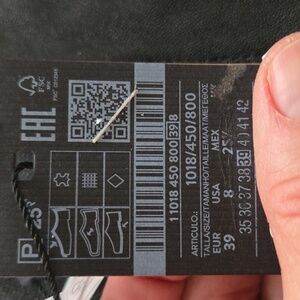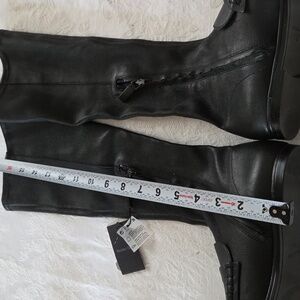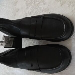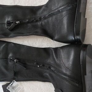 Black leather loafer style, knee high boot perfect for tights and mini skirt look. Would work for in office chic, not as a rigged winter boot. Massimo Dutti women's size 8 with side zipper. 17" from floor to top of boot, so not quite over the knee. Extremely hip and stylish. Women's size 8