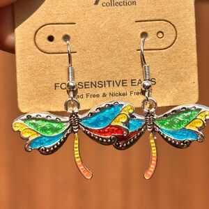 Colorful dragonfly earrings with silver accents. Features vibrant red, green, and blue details.