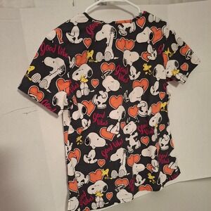 Keywords: Snoopy scrub top, Peanuts medical uniform, Woodstock nurse top, Good Vibes scrubs, V-neck scrub top floral, cartoon scrub top, pediatric nurse scrubs, veterinary scrub top, character scrubs small, holiday scrub top, valentines day scrubs, black character scrubs, heart
