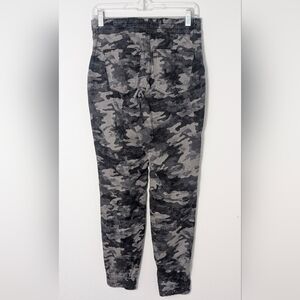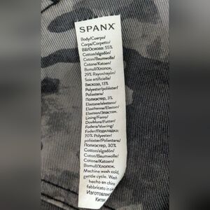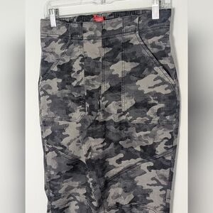 The SPANX Stretch Twill Cargo Jogger Pants are a stylish and versatile choice for women looking for a comfortable and flattering fit. These gray pants feature a camouflage pattern, ankle zip closure, and tapered leg style. Made with a cotton blend fabric that offers stretch and pockets for convenience, these pants are perfect for travel, casual wear, and even workwear. The high-rise waist and flat front give these slimming pants a chic and modern look, suitable for any season.