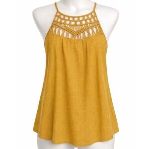 Mustard Yellow Boho Tank Top Crochet Macrame Neck Sleeveless Womens S Blouse