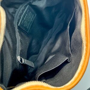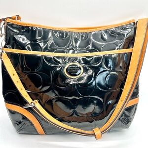 Elegant Coach shoulder bag with glossy black finish and tan leather trim. Ideal for everyday use.