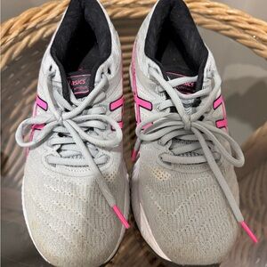 Elevate your workout with ASICS athletic shoes. Stylish gray with vibrant pink accents. Perfect for comfort and performance.