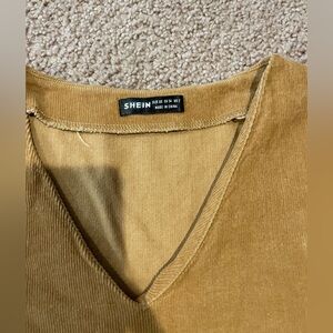 SHEIN V-neck Puff Sleeve Belted Tan/ Brown Mini Dress, size EXTRA SMALL, made of cotton bkend/ corduroy material, in brown color, puff sleeve accent, preloved, in excellent condition.