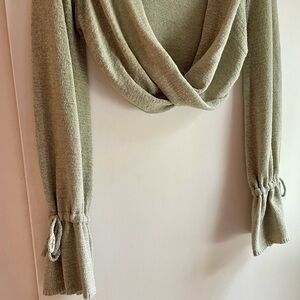 Chic grey sage sweater with a draped neck. Long sleeves with tie details. Perfect for layering.