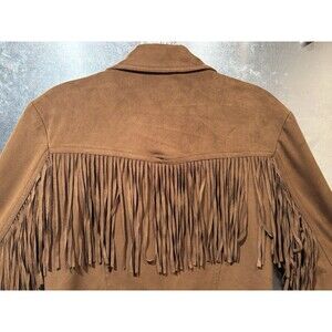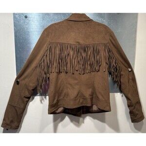 The JouJou Faux Suede Leather Fringe Asymmetrical Zip Motorcycle Jacket in size Large is a stylish and versatile addition to any wardrobe. Made from polyester with a Brown soft faux suede fabric type, this mid-length jacket features long sleeves, a zip closure, and lined interior for added comfort. The asymmetrical zipper & zippered cuffs adds a unique touch, while the fringe accents give it a trendy edge. Ideal for various occasions from casual outings to parties, this jacket captures a Western, biker, and hippie vibe, making it a fashionable choice for any season.