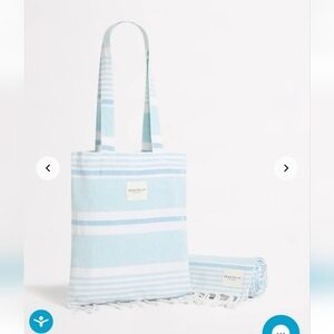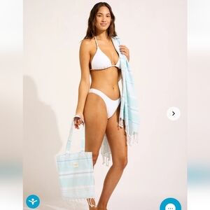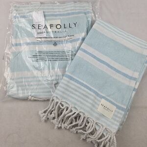 Stylish beach towel set by Seafolly. Features blue and white stripes. Includes matching tote bag. Perfect for beach days.