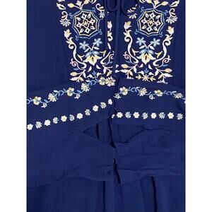 Altar'd State Top Blouse Women's Size S Embroidered Floral Long Sleeves Blue. Beautiful blouse labeled as a size small and measurement photos are included. The sleeves have little notch details and there is a tie at the neck. She has an empire waist hem. Boho, glam, playful, feminine, pretty, coquette, twee