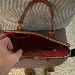 Chic and stylish satchel. Rich burgundy with tan accents. Perfect for any occasion.