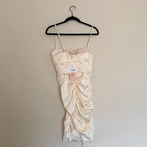 Oh Polly Cream Ruched Mini Dress w/ Lace Trim Satin in Oyster White NWT Size 8