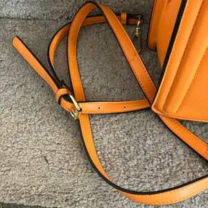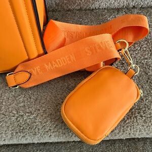 Used once and is like brand brand new. TikTok viral bag Steve Madden Bevelyn neon orange Crossbody bag with two adjustable and detachable straps. A wide nylon strap with Steve Madden logo and a vegan leather strap both with gold tone hardware. Bag can also be used as a satchel. Small AirPod Case which can be used for carrying your AirPods or for whatever you like. Purse is divided into two large compartments one side with a snapped closure the other side with a full zipper closure. Both are beautifully lined with Steve Madden signature lining with the zipper compartment having a large zippered pocket. Bag is 9” x 7 1/4” x 5”. Both Crossbody straps have a drop of 24 inches which of course can be made smaller.