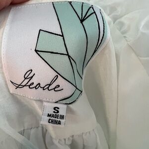 Wore this a few times. Love the pale blue polka dots and fit. Button is missing at back, any small button would work. No marks or snags that I can see. Wish it still fit me.