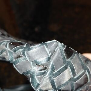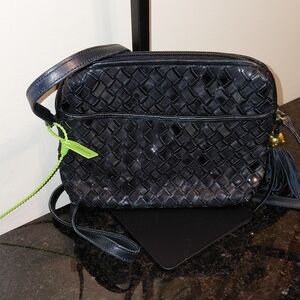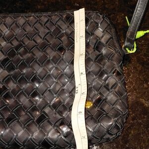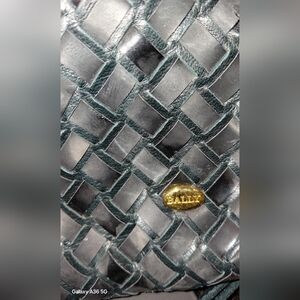 Bag features a woven (Intrecciato) matte & patent leather design with gold tone hardware. Good to very good condition. No rips, tears or excessive wear to bag or corners. General overall wear consistent with a vintage bag. Interior is leather lined, with 1 zip pocket. Please review photos to confirm condition, size and features.