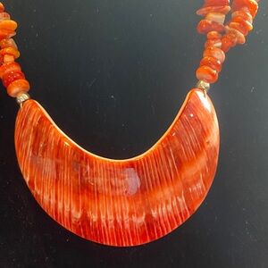 This bold, artisan-crafted necklace features a striking crescent-shaped spiny oyster shell pendant paired with a richly textured strand of natural spiny oyster shell chip beads, accented with small turquoise spacer stones. The dramatic crescent focal displays beautiful natural banding and organic color variation in warm coral, orange, and red tones, creating a powerful Southwestern statement.
