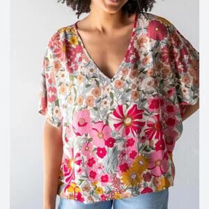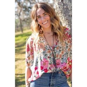 Natural Life Easy V-Neck Short Sleeve Top Pink Mustard Floral Women’s size Small