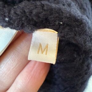 This is a navy blue cashmere sweater in a honeycomb pattern by SOCAPRI. Made in Italy. Cashmere. It is thicker than most cashmere I’ve felt. Feels luxurious. Size medium. Hand wash.