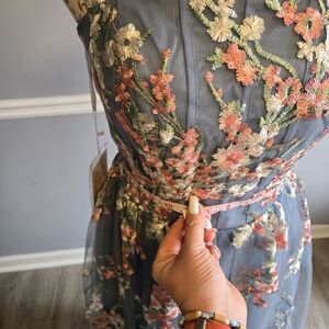 Elegant blue dress with floral embroidery. Perfect for special occasions.