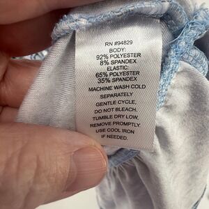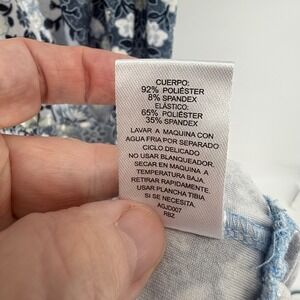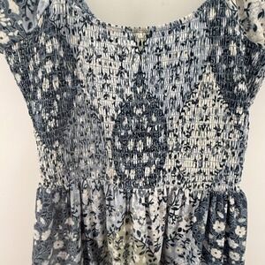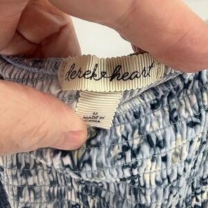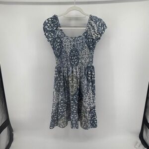Derek Heart floral mini dress features a charming blue and white patchwork-style botanical print. Designed with a fully smocked bodice for a flexible fit, it includes short puff sleeves with lettuce-edge trim and a square neckline. The lightweight fabric blend offers a comfortable stretch, making it an ideal choice for casual outings or summer events.