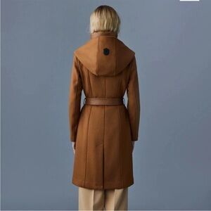 Mackage Shia two-in-one coat crafted from soft double-face wool featuring the hooded Signature Collar and a removable light recycled down bib with stand collar. Expertly crafted with double-face wool, a shell and leather sash belt accentuate the fitted asymmetrical zip front. Mixed media details and leather welts add elegant edge. A versatile tri-season staple with high-impact style.