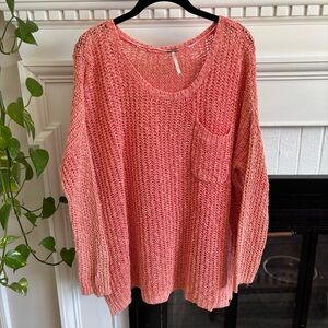 Free People Open Loose Knit Coral Pink Orange Sweater Medium Cotton Pocket