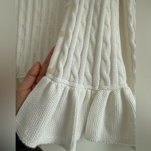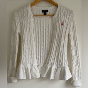 Classic Polo Ralph Lauren girls cardigan in a timeless cream/white cable knit. Made from 100% cotton—soft, breathable, and perfect for year-round layering. Features a button-front closure, feminine peplum hem, and the iconic embroidered Polo pony logo at the chest.