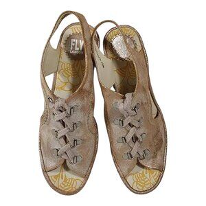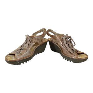 Fly London Yifa Leather Lace-up Wedge Sandals Metallic Taupe Good Cond - 39