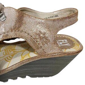 Metallic taupe/rose gold leather wedge sandal from Fly London. Peep toe. Lace-up close. D-ring hardware. Ankle strap. Side cutout. Padded insole and textured outsole for comfort. Good condition, light wear only, no flaws.