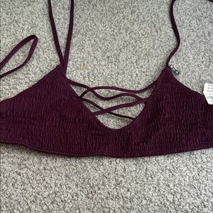 Stylish burgundy bikini top featuring crisscross detail. Perfect for beach days.