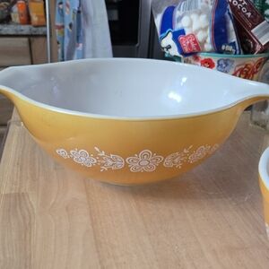 Butterfly Pyrex vintage mixing bowls with a yellow floral design. Perfect for kitchen use or display. Near Perfect Condition