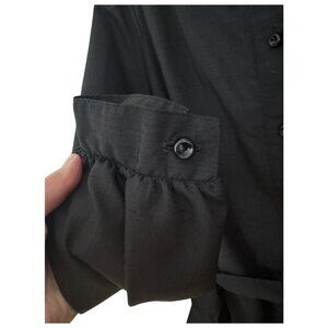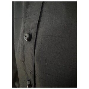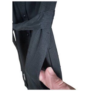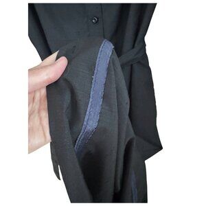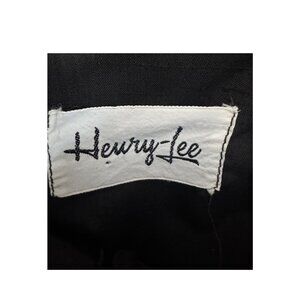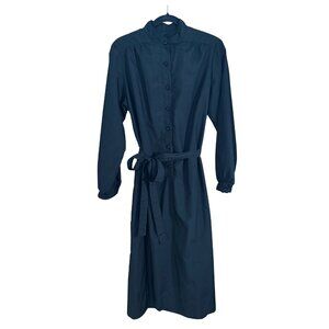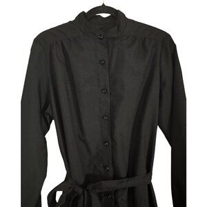 True vintage Henry-Lee black shirt dress featuring a full button front, long sleeves with button cuffs, pockets, and a matching self-tie waist. Designed with a band collar and midi-length silhouette for a timeless, polished look. Lightweight woven fabric with beautiful drape. Classic 1960s to 1970s minimalist workwear style.