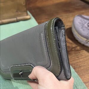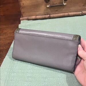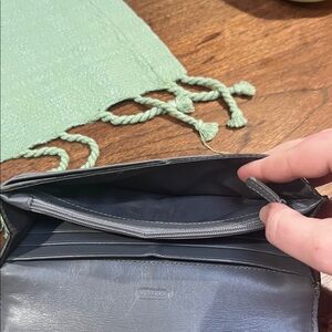 This elegant gray wallet is perfect for organizing your essentials with style. Its sleek design and high-quality material make it a must-have accessory. This wallet has been very well loved. Pictures will show. Zipper still works even though it’s missing a claw.
