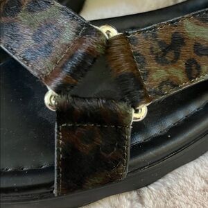 Stylish sandals featuring a leopard print design. Black soles provide a sleek contrast. Perfect for casual outings. New without box