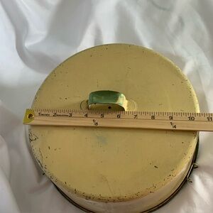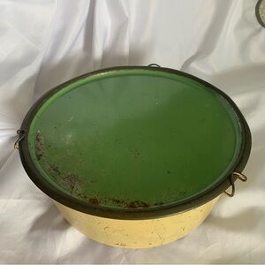 Vintage mid-century metal cake tin carrier in green and yellow.