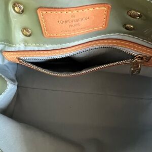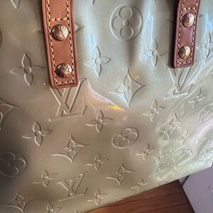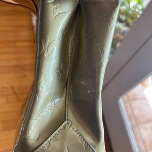 Louis Vuitton Monogram Vernis Reade PM tote bag in sage green patent leather.