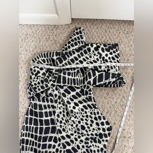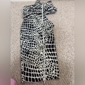 Excellent condition this chic one shoulder dress, featuring a bold black and white snake print pattern. Perfect for any stylish occasion.