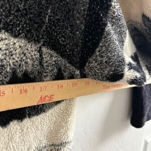 Black Mountain Outdoor fleece jacket features a striking scenic night landscape with a crescent moon, snowy mountains, and a sledding scene. This heavyweight sherpa-style fleece provides exceptional warmth with a full-zip front and an adjustable drawstring hem for a custom fit. The monochromatic black, grey, and white palette gives this outdoor-inspired piece a versatile, vintage aesthetic.
