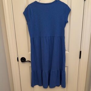 This casual sundress from LOFT showcases a vibrant blue color with a charming ruffled and tiered design. Featuring short sleeves and a crew neck, it offers a relaxed fit perfect for everyday wear. The soft fabric and flowing silhouette make it an ideal choice for a laid-back day out.