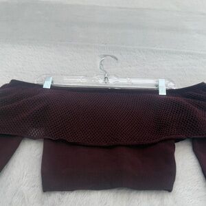 Stylish off-shoulder burgundy top with mesh crochet like detail. Perfect for a chic look. This is a beautiful fitted sweater, gently used, no rips or stain seen. The overlay on the tap, gives it a beautiful flare of style. This is a small/medium. Please feel free to bundle with other items for better pricing.