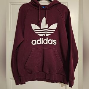 Adidas Men's Burgundy Hooded Sweatshirt with Adidas Logo and Name. Front Pocket.